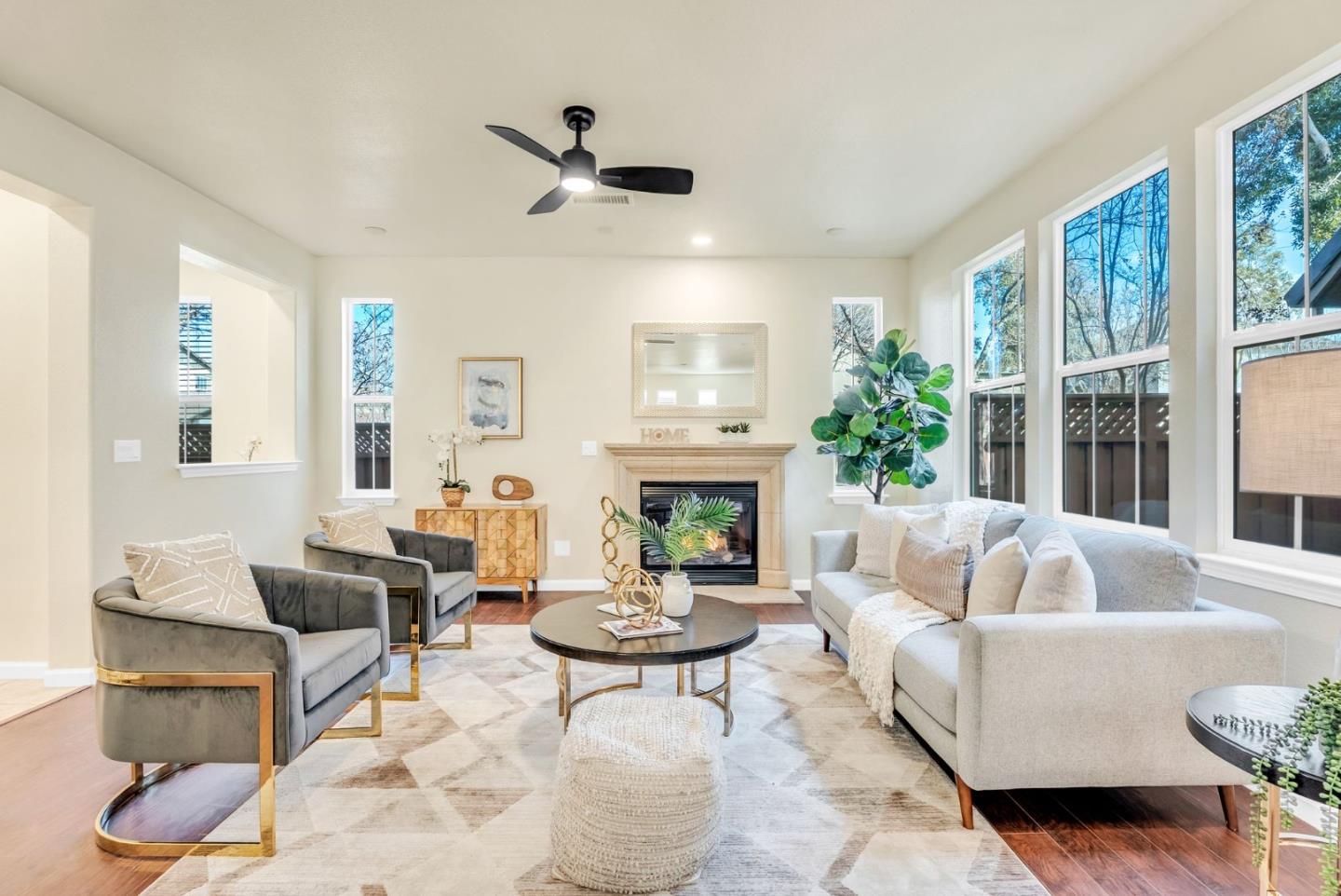 Welcome to this beautifully maintained 4-bed, 3-bath home nestled on a desirable corner lot in Mountain House. This move-in-ready residence features a gated front courtyard and a thoughtfully designed floor plan with a bedroom conveniently located on the main level. The stylish kitchen boasts slab granite countertops, ample white-painted cabinetry, stainless steel appliances including a microwave, oven range & refrigerator ,an island with a sink and breakfast bar, and a built-in desk alcove. The inviting living room offers laminate flooring, a gas fireplace, and a lighted ceiling fan, creating a warm and welcoming atmosphere. Upstairs, the spacious primary suite features French doors leading to a private balcony, dual sinks, a soaking tub, a stall shower, a walk-in closet, and tile flooring. An additional study corner provides the perfect space for a home office or reading nook. The laundry room is equipped with cabinetry, tile flooring, & both electric & gas dryer hookups, with the washer & dryer included. The finished and painted garage features built-in wood shelving, an automatic opener, and a side door leading to a charming stone patio. Located within walking distance of Altamont Park and Altamont Elementary School, this home offers both convenience and modern comfort.