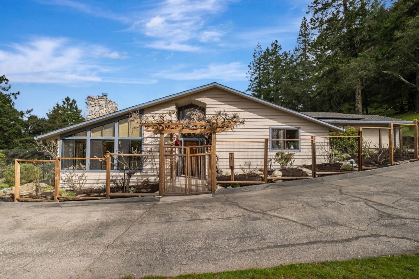Situated at the end of the desirable Hidden Glen neighborhood, this house on a hill has great views. Close proximity to Henry Cowell State Park, Scotts Village and the Kings Village Shopping Centers. The home has a rich history with the living and dining room's design to host music performances. Skylights and windows make this home bright. The central vacuum system has outlets throughout including the garage. Each of the 3 levels is only a few steps away. Relax in the hall bath jet tub at day's end. The kitchen features a Wolf 5 Burner Range and built-in Thermador Convection Oven. The Thermador exhaust hood has heat lamps. Granite counter tops, a breakfast nook and pantry are included. The home's interior was recently painted and highlights the wood finishes. Green thumb paradise. Cecil Brunner roses give the stone chimney a cottage-like feel. A mature wisteria plant drapes across an arbor at the main entrance. A stunning magnolia tree with vibrant magenta blossoms stands in the front yard. Rose bushes and drought-tolerant pollinator plants, such as rosemary, lavender, and lion's tail decorate the yard. Use design creativity to take advantage of the land above the home for stunning views of the forest, mountains and starry nights.