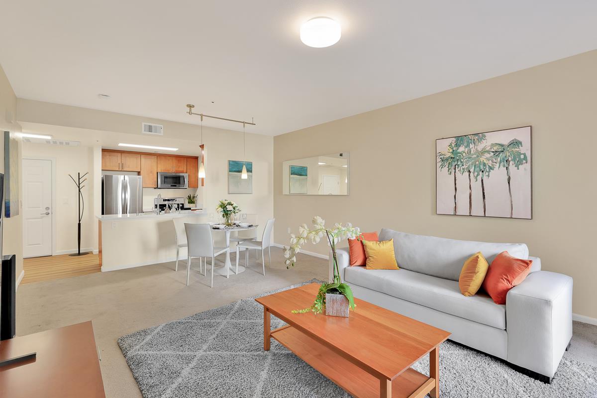 Discover elegance and comfort in this desirable first-floor end unit, perfectly situated in a quiet courtyard. Enjoy your private patio, ideal for morning coffee or evening relaxation , with a storage closet for added convenience. Inside, you'll find real-wood cabinetry with soft-close drawers, quartz countertops, and premium Moen and Kohler fixtures. Vinyl plank flooring in the kitchen and bath adds durability and style. The spacious bedroom features two closets, including a walk-in, while the bathroom offers both a separate shower stall and a shower-over-tub for ultimate comfort. Designed for modern living, this home includes a new heat pump for efficient heating and cooling, an in-unit washer and dryer, sprinkler system, and hardwired smoke/CO2 alarms. Designer window treatments and stylish pendant lighting enhance the ambiance. Enjoy the resort-style amenities which include a gym, pool, clubhouse, elevator and more just steps away. Your deeded underground parking spot adds security and convenience. Reservable guest suites walking distance to Vito's Trattoria and easy access to highways 101, 280, and 880, plus nearby VTA and San Jose Airports free shuttle, this home offers the perfect blend of luxury and accessibility.