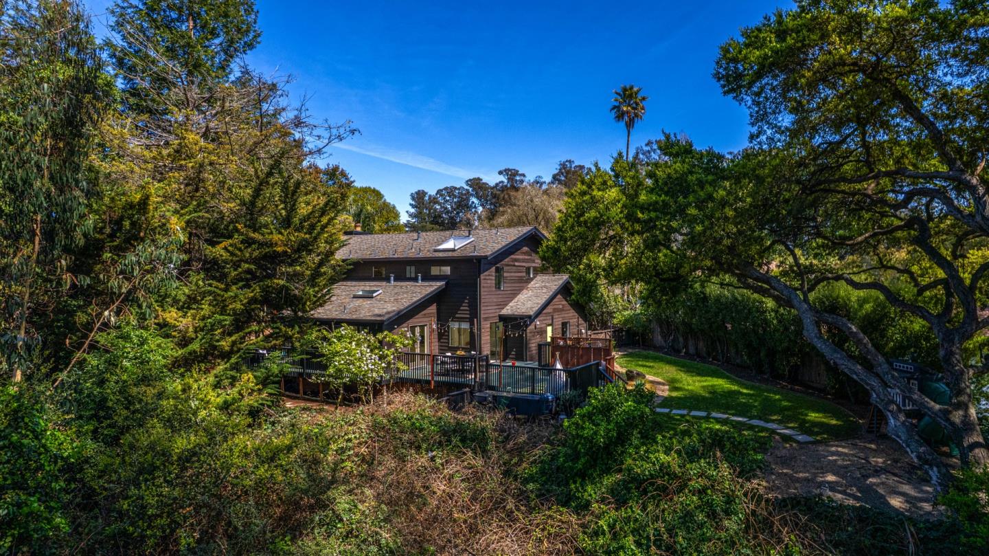 Tucked away at the end of a quiet cul-de-sac, this 3-bedroom, 2.5-bath, 2,208 sq. ft. retreat is a true hidden oasis. With a park-like setting and a secret garden feel, this home offers an unexpected sense of serenity while still being in a prime location. Just around the corner from the 67-acre Arana Gulch greenbelt, enjoy easy access to scenic walking and biking trails leading to sunny coastal meadows along the Santa Cruz Yacht Harbor. Plus, some of the best stretches of sand and surf on the California coast are just minutes away. Inside, soaring ceilings and a dramatic central fireplace set the tone, while the open kitchen with a large center island is perfect for gathering. The floor plan offers flexibility with a ground-floor bedroom or office, and a luxe primary suite upstairs. Designed for seamless indoor-outdoor living, the home opens to expansive decks, lush lawns, and garden spaces under the canopy of a stunning old oak. Recently refreshed throughout, this private retreat is a rare find offering both tranquility and convenience.