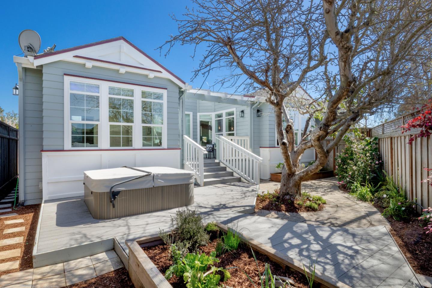 Experience the Santa Cruz lifestyle in this nearly new home, ideally located near stunning beaches like Corcoran & Sunny Cove. Enjoy easy access to scenic walking paths, dining, coffee shops, and a lively farmer's market every Sunday. This home offers the ideal setting for those seeking a vibrant yet tranquil community experience. The sunlit living area boasts high ceilings, a stone fireplace, and expansive windows overlooking the sizeable yard with an inviting deck, patio, hot tub, majestic apple tree, and vibrant blooming flowers. The chefs kitchen is equipped with granite countertops, stainless steel appliances, ample storage, and breakfast bar that seamlessly integrates with the open living/dining space. Recent upgrades include luxurious new flooring, fresh interior/exterior paint, and updated lighting. The spacious primary suite features a luxurious en-suite bathroom and views overlooking the garden. Separated are the second bedroom and a versatile den/office which can easily be converted back into a third bedroom if desired. Villa Santa Cruz is a thoughtfully designed, resident-owned community that features wide open streets and meticulously maintained outdoor spaces. Enjoy pristine pool, spa, clubhouse, RV parking, and smart park management. You truly can have it all!