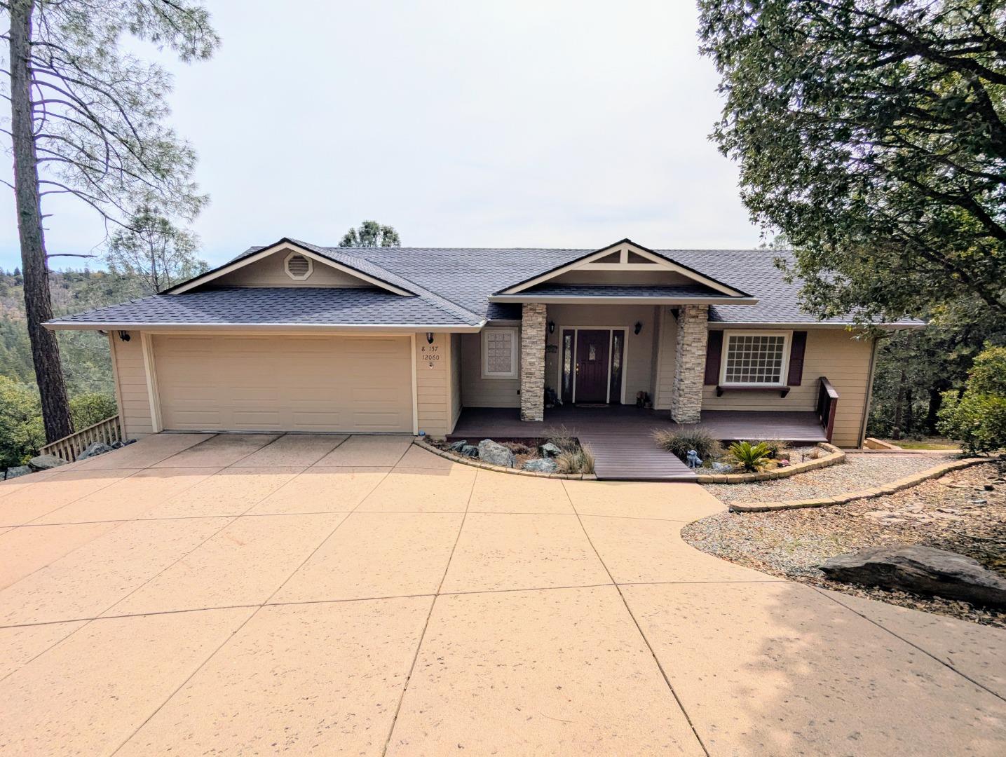 Welcome to this beautifully maintained, turn-key home with one of the best views in Pine Mountain Lake, Groveland, just 25 miles from Yosemite. Meticulously cared for by full-time owners, this home boasts a new premium GAF roof with a 50-year transferable warranty, a newer 5-ton Lennox A/C system, and a 24 kW whole house generator for peace of mind during power outages. Step outside to two large Trex decks offering breathtaking views of the Yosemite mountains. Inside, the living room and kitchen feature large sliding glass doors to maximize the stunning scenery. The cozy living room includes a beautiful wood-burning fireplace with stone surround, ideal for chilly winter nights. The spacious kitchen is a chefs dream with stainless steel appliances, soft-close cabinets, pull-out drawers, and a walk-in pantry. The primary suite offers sliding doors leading to the deck, while the en-suite bathroom boasts a large tub, walk-in shower, his-and-her sinks, and a walk-in closet. Downstairs, you'll find a separate living area, two bedrooms, a Jack-and-Jill bathroom, and another deck with stunning views. Additional perks: hot tub, kayaks, 2-car attached finished garage. The community offers property owners and guests 24/7 security, a private lake, swimming pool, tennis, pickleball and more!