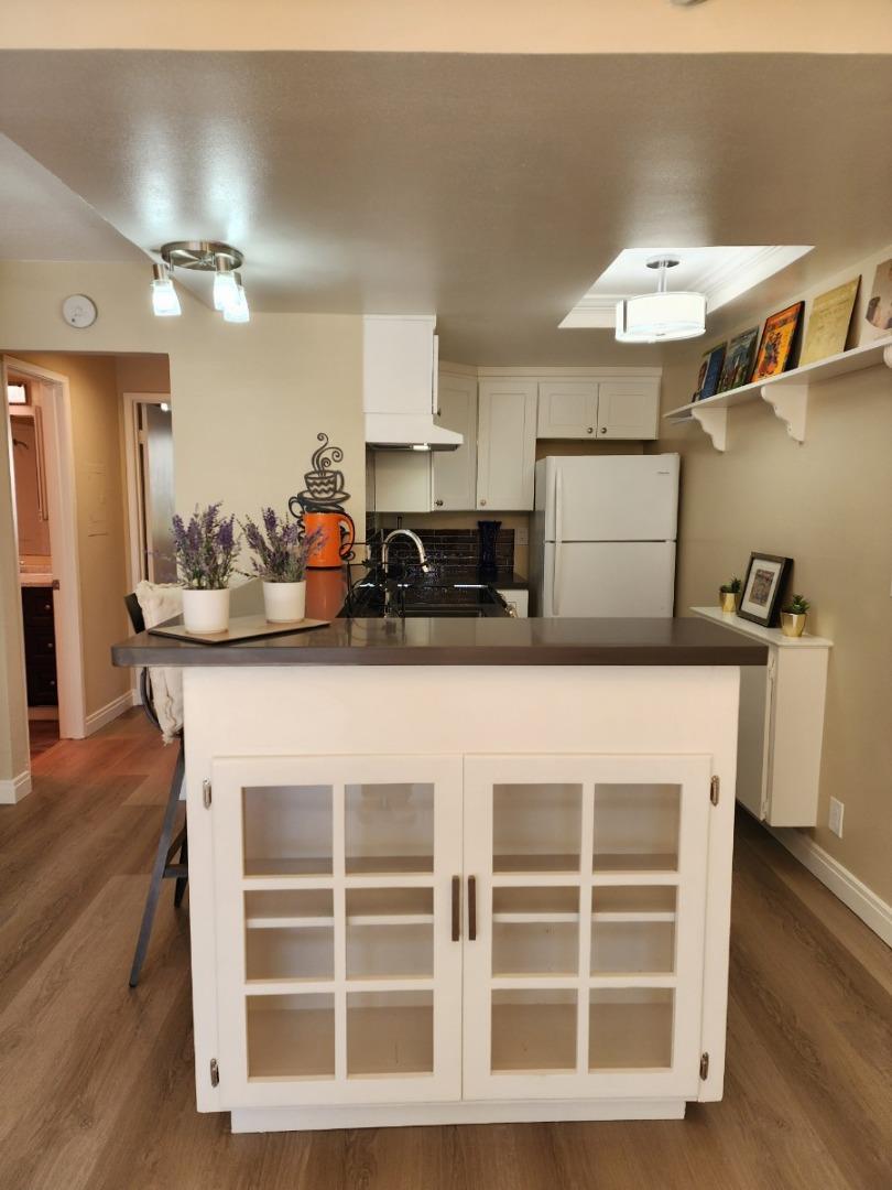 BEST COMMUNITY IN CUPERTINO SCHOOLS!! Oasis in the city! Wonderfully BRIGHT 1 bed 1 bath 690 sf condo Spacious ground floor unit features Brand New kitchen with quartz counters, LG SLS appliances, one of the Best quality Luxury Laminate floors throughout and beautifully refinished bath tub with tile shower and granite counter. Tranquil and bright wall of windows leading out to large sunny patio to relax and enjoy the sound of lagoon fountains. This unique end unit of community has the best location in center of highly desired Vista Del Lago complex featuring walking trails, mature trees, lagoons, 2 swimming pools, jacuzzi, gym, sauna, clubhouse, pool tables, and laundry rooms. Unit has 1 car space #9 & street parking, storage unit plus guest parking. Low Santa Clara electricity. Complex is centrally located close to Apple Campus, Santana Row, Valley Fair and many tech companies. Easy access to Interstate 280 & 880 and Hwy 17. A TRULY A MUST SEE with the Secret Closet Space!