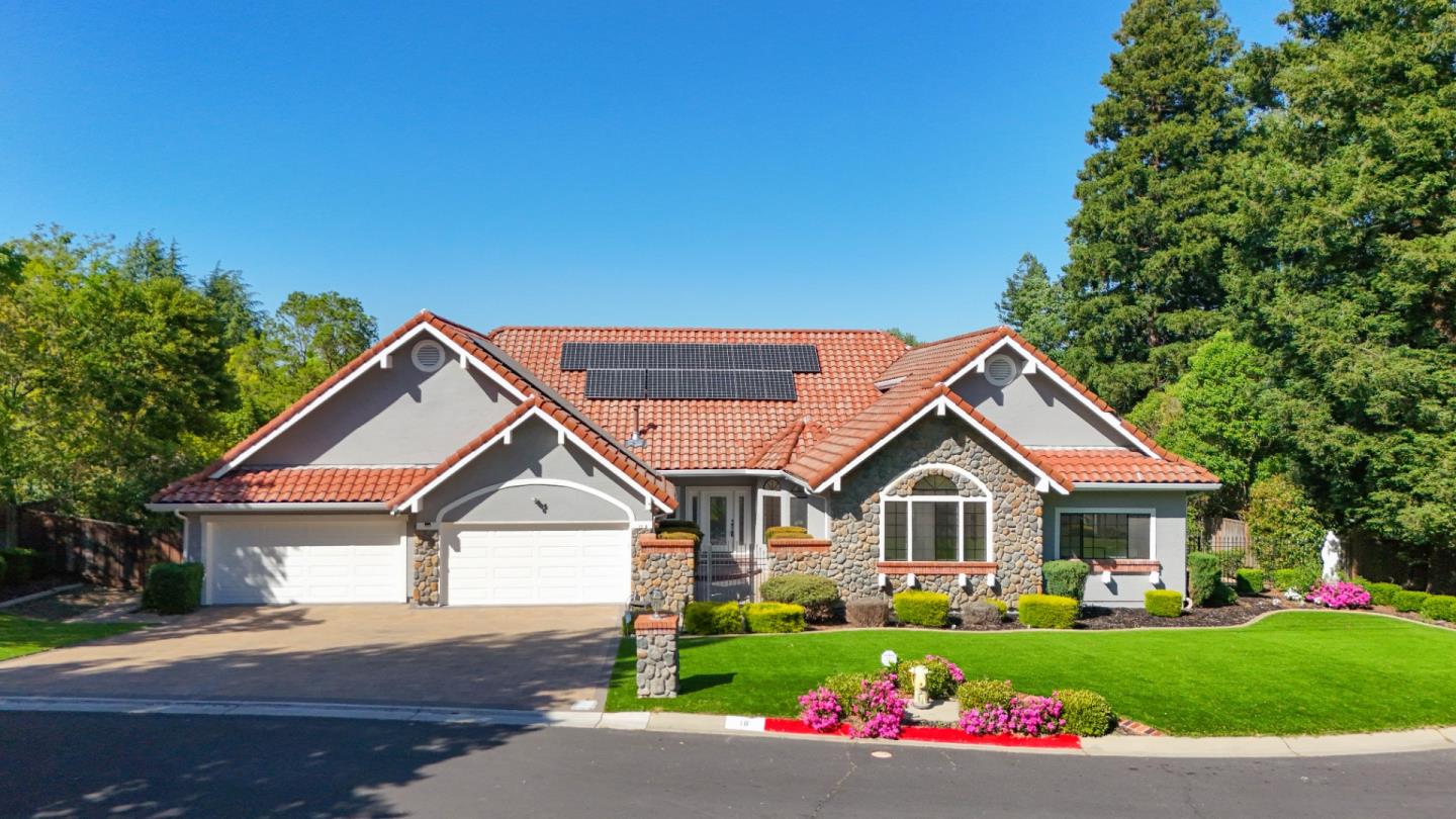 Welcome to 18 Foothill Pl an exceptional single-story 4BD/3.5BA home tucked away on a quiet court, offering breathtaking mountain views from both the front and backyard. Thoughtfully designed with comfort and style in mind, this home features a spacious layout with open living and dining areas, a brand-new chandelier, and a beautifully remodeled kitchen with quartz countertops, stainless steel appliances, custom cabinetry, and a walk-in pantry. The expansive family room includes a stylish wine bar with a built-in wine fridge perfect for entertaining. The primary suite offers double sinks and a large walk-in closet, while the bright and airy guest bedrooms provide comfort and privacy for family or visitors. Step outside into a serene backyard retreat, complete with a gas-heated in-ground pool and an orchard-like setting filled with avocado, grapes, donut peaches, Asian pears, plums, figs, loquat, goji berries, and orange trees. Additional features include a fully owned solar system with 30 panels, EV charger, in-unit laundry, and a 4-car garage. No HOA. Conveniently located just minutes from Foothill High School, Safeway plaza, Pleasanton Ridge Regional Park, Costco, and 99 Ranch Market, with easy access to high way. A rare combination of space, quality, and convenience.