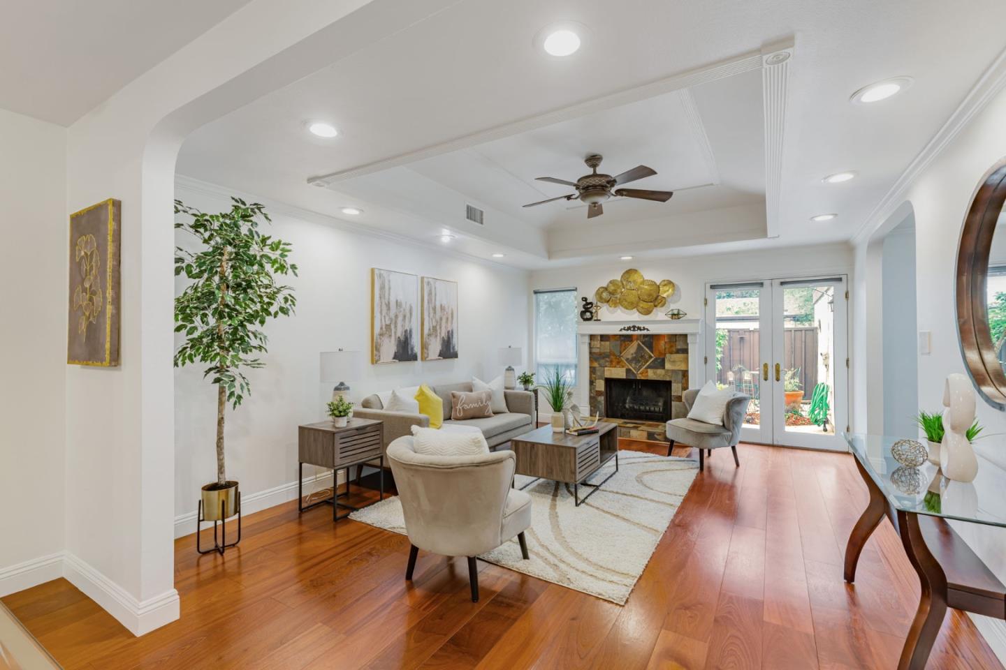 Bright & beautiful corner lot, rarely available 3 bedrooms 2 full bathrooms single level townhouse in the desirable community of The Trees Garden with direct access to the California Nursery Historical Park. Large private patio with a lush garden surrounded by nature & majestic trees. A meticulously maintained home with tasteful upgrades, featuring a large primary bedroom with ensuite, walk-in closet, and a glass slider door that opens up to the patio. Stunning top quality African Mahogany engineered wood floor, upgraded recessed lightings throughout, smart home devices, new wine fridge, new roof, new vanity & more! Low monthly HOA covering water, all exterior maintenance and painting, roof and access to swimming pool and clubhouse. Attached garage, visitors parking and street parking just steps away. Minutes drive to Fremont Shopping Center, BART station, restaurants and shops. Welcome to your home sanctuary!