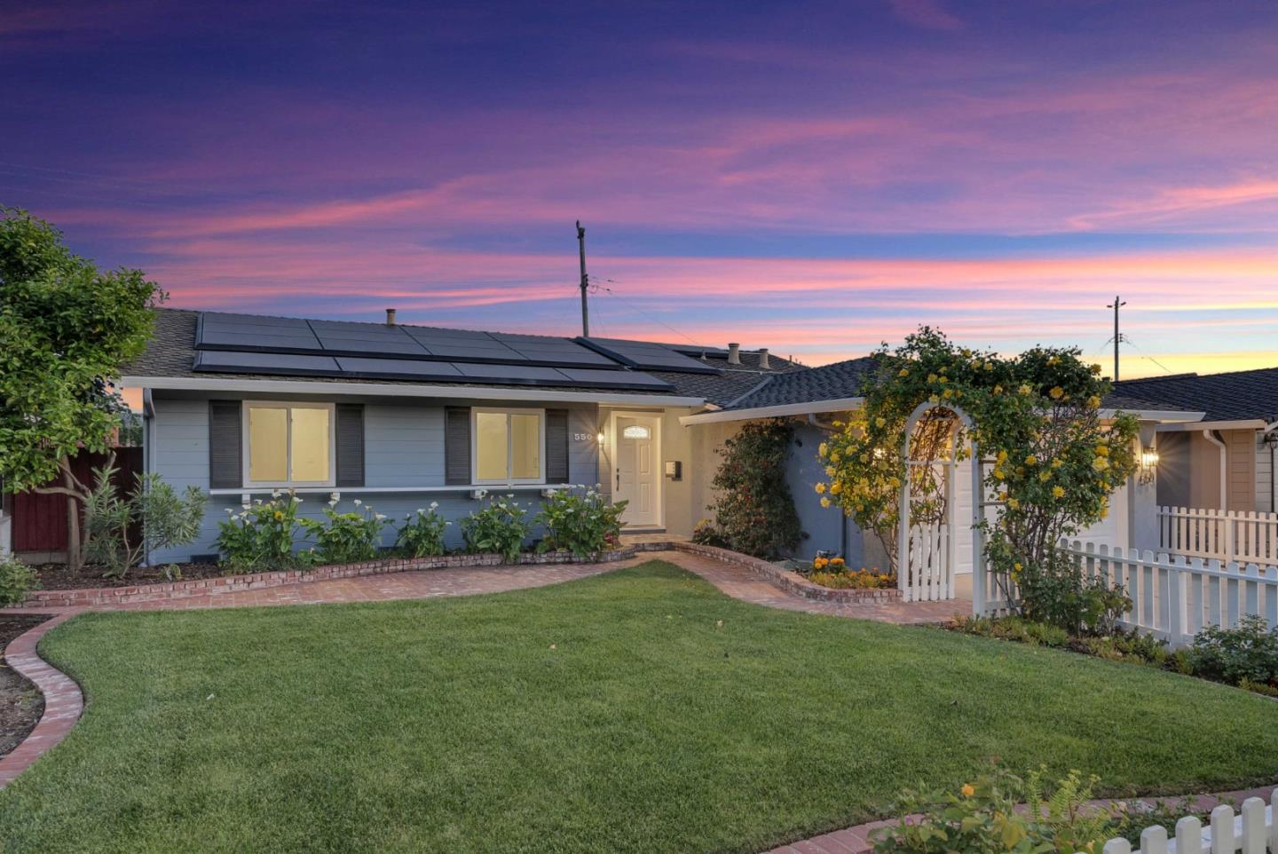 This picturesque home showcases a white picket fence, lush green lawn, and a trellis adorned with vibrant yellow roses. Beautiful rose gardens accents both the front and back yards, complemented by a rare "Curry Leaf" tree. Recently remodeled, the open kitchen boasts white cabinetry, stainless steel appliances, a spacious island, and a full dining area. Natural light fills the expanded family room, enhanced by gleaming engineered hardwood floors, updated LED recessed lighting, and modern fixtures. The living room includes a cozy fireplace, while the bathrooms are fully updated with custom finishes. All bedrooms are outfitted with over $50K in custom California Closets. The primary suite opens to a patio lined with roses and a private courtyard lounge. Additional upgrades include solar panels with two Tesla Powerwalls for backup power. A full-home AquaSana water filtration system removes chlorine and softens waterhelping reduce dry skin, hair loss, and allergies. The finished garage features epoxy flooring and enhanced lighting. Challenger School, highly desired Santa Teresa High and Herman Intermediate are minutes away. Ideally located near hiking trails, Oakridge Mall, Nob Hill Market, dining, freeways, and morethis home blends charm, upgrades, and convenience.