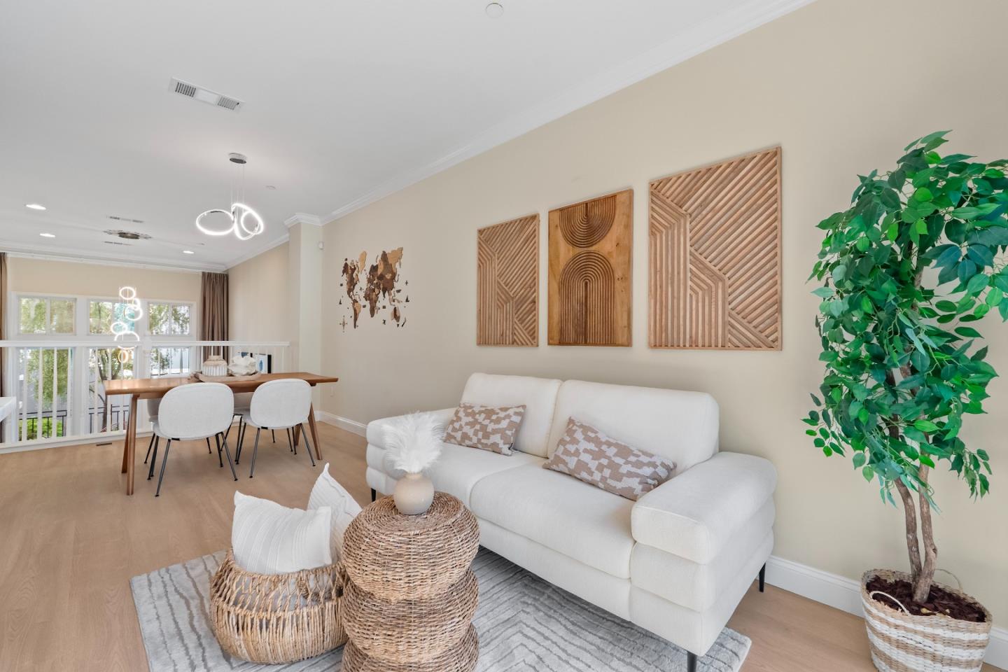 Modern and beautifully maintained east-facing townhome in the heart of Sunnyvale, just minutes from the newly revamped Downtown and Caltrain. This 3 bed, 2.5 bath home offers soaring ceilings in the spacious living room, new flooring throughout the living areas and bedrooms. The open-concept kitchen, dining, and living space is ideal for entertaining, featuring quartz countertops, gas cooktop, SS appliances, and direct access to a balcony for fresh air and light. Oversized east-facing windows flood the home with natural light. Upstairs, all three bedrooms, laundry (with washer/dryer), and two full baths are conveniently located on one level. The primary suite boasts a walk-in closet, dual vanities, a soaking tub, and stall shower. Enjoy central AC/heating, and a 2-car garage in a well-kept community just over 10 years old. Close to Apple, Google, Amazon, LinkedIn & more. A fantastic opportunity in a prime location!