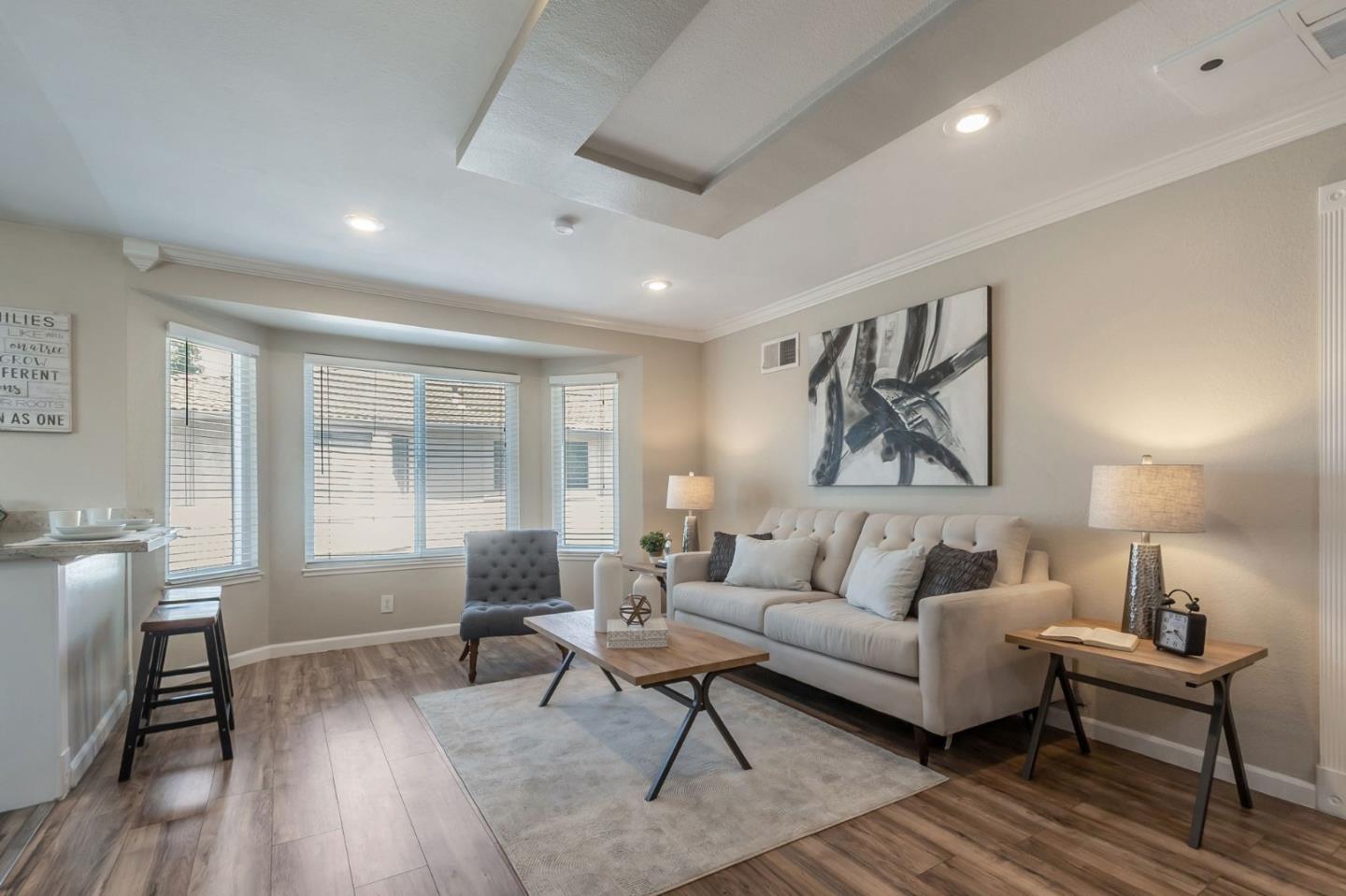 Welcome to this bright and airy 1-bed, 1-bath upstairs end unit located in a quiet and well-maintained, pet-friendly community. Thoughtfully updated throughout, this move-in-ready condo features an open floor plan with sleek flooring and abundant natural light. The modern kitchen is equipped with new cabinetry, granite countertops, stainless steel appliances, and a convenient breakfast bar-perfect for everyday living and entertaining. Additional highlights include in-unit laundry, a recently renovated bathroom with a stone vanity and shower-over-tub, and double-pane windows installed within the last four years for enhanced energy efficiency. Stay comfortable year-round with new wall AC units, new water heater, and water softener system. Enjoy the privacy and tranquility of a unit tucked away at the back of the complex, complete with a 1-car garage and extra storage. The community offers lush landscaping, a large swimming pool, a playground, and is welcoming and ideal for enjoying the outdoors with your furry companion and little ones. Low HOA dues cover water, garbage, and cable, making this home an exceptional value. Dont miss this opportunity in the heart of San Jose, perfect for first-time buyers, investors, or anyone seeking low-maintenance living in a great location!