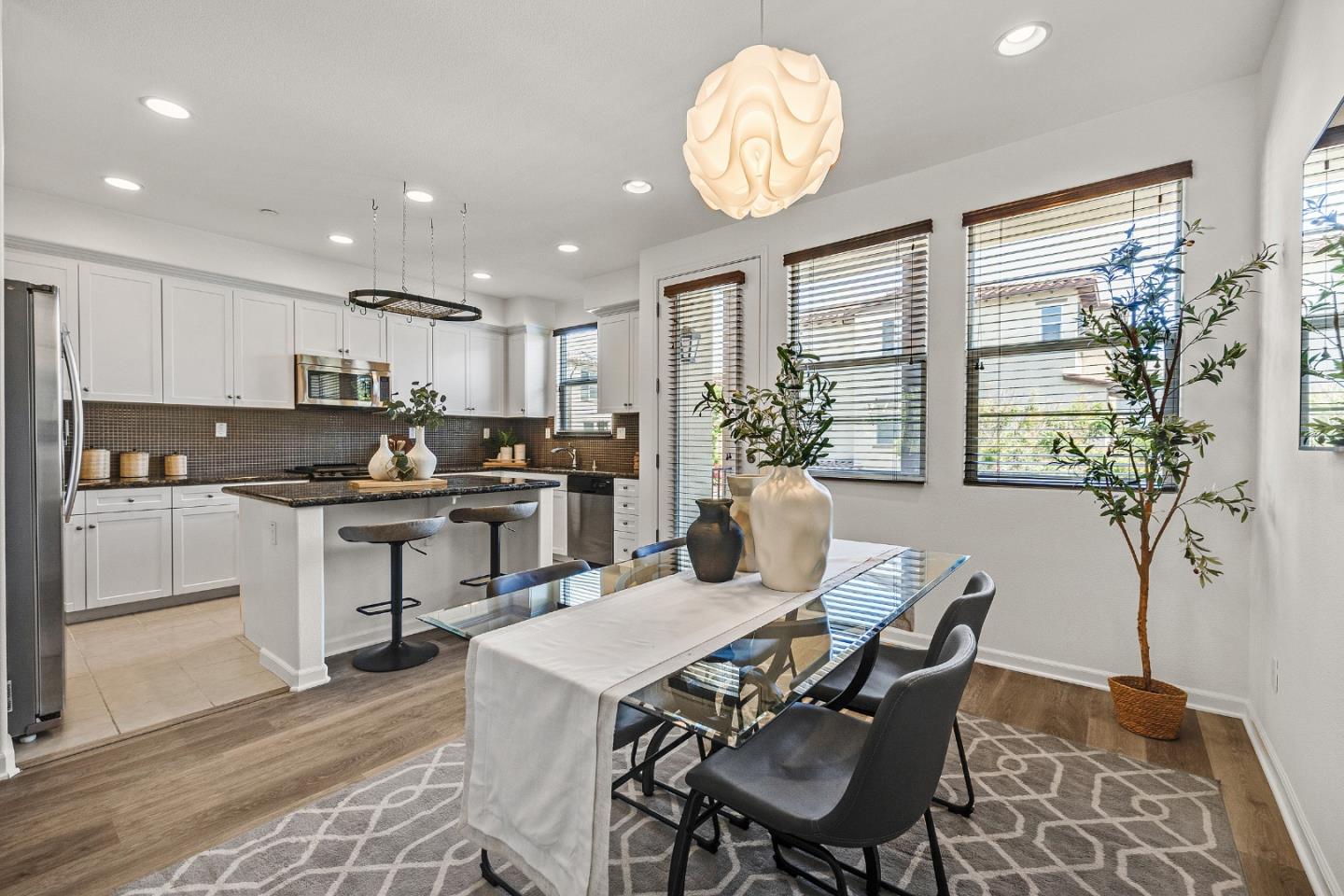 Spacious 4-bedroom, 3.5-bath home offering approximately 1,750 sq. ft. of living space and an ideal, flexible floor plan. Ground-level bedroom with full bath-perfect for guests or home office. Enjoy a private patio and large balcony. The kitchen features granite countertops, gas stove, stainless steel appliances, and a roomy eat-in area. New paint and flooring throughout, custom wood shutters, central heating & AC, and SunPower Signature solar panels for energy efficiency (see HOA docs). Attached finished 2-car garage and home wired for networking. Excellent location within the community! Just minutes from Apple, LinkedIn, shopping, parks, and major highways (101 & 237). Move-in ready and close to everything Sunnyvale has to offer.