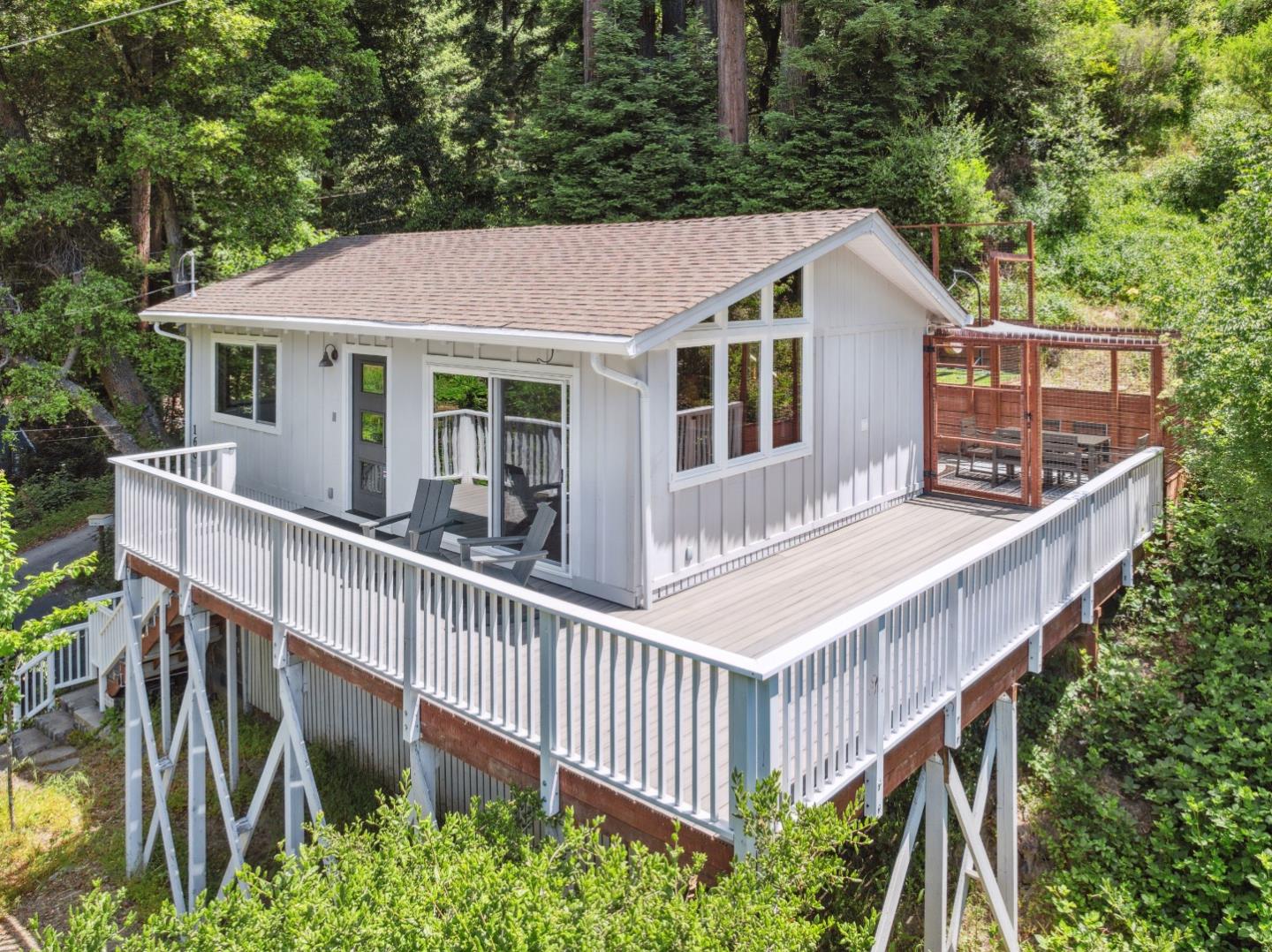 Discover serene living in this charming home perched above a close-knit, well-kept neighborhood. Nestled among towering redwoods, the private backyard is perfect for summer hammock lounging or soaking up winter sun with stunning ridgeline views. Inside, vaulted redwood ceilings and a dramatic wall of windows frame the valley, creating a sense of peace and space. Watch fog roll majestically over the valley or bask in sunlight streaming through the south-facing windows. Thoughtful design includes leafguard gutters, a spacious Trex deck, LVP flooring, and low-maintenance astroturf, making outdoor living effortless. The expansive deck is perfect for entertaining or simply unwinding in your own private retreat. Excellent location with easy access to downtown Boulder Creek and all that it has to offer, including grocery stores, delicious restaurants, nightlife, and more. Experience tranquility, privacy, and community all in one place.