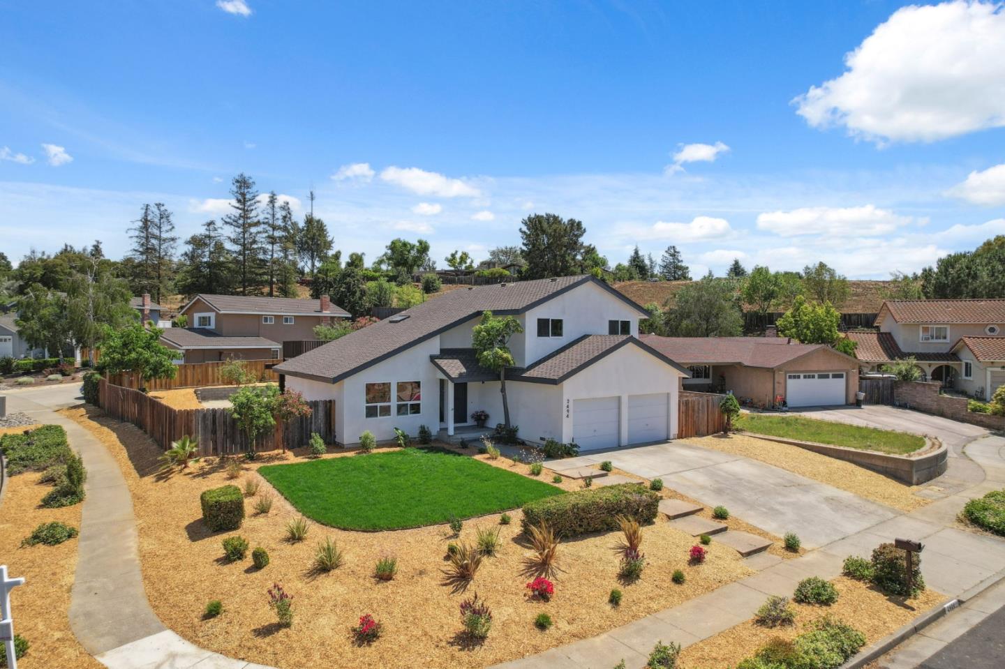 Welcome to your California dream home! A stunning Evergreen Hills retreat nestled on a spacious 10,400 Sq.Ft. corner lot in a quiet cul-de-sac with stunning hillside views and Great Schools! This turn-key home offers 1 downstairs bedroom for guests or office space. The open-concept design with soaring vaulted ceilings & newly remodeled chefs kitchen is an entertainer's dream, featuring a striking quartz island, designer backsplash, modern stainless steel appliances, & walk-in pantry. The spacious primary suite offers a serene retreat with a separate sitting area. The newly remodeled ensuite bath offers dual sinks, custom vanity mirrors, updated flooring, & walk-in closet. French doors lead to a brand-new $30,000 spacious redwood deck, where you can relax & take in sweeping views of the hills & enjoy watching the 4th of July fireworks. Enjoy sunny days by the sparkling pool, RV parking & ample outdoor space with great potential for possible ADU or expansion. Add'l highlights include dual-pane windows, elegant chandeliers, new interior paint, newly exterior stucco, & lots of storage. Short walk to top-rated Cadwallader Elementary & minutes from shopping, dining, scenic walking trails, & the popular Creekside Cabana Club. This is more than a home, it's a lifestyle!