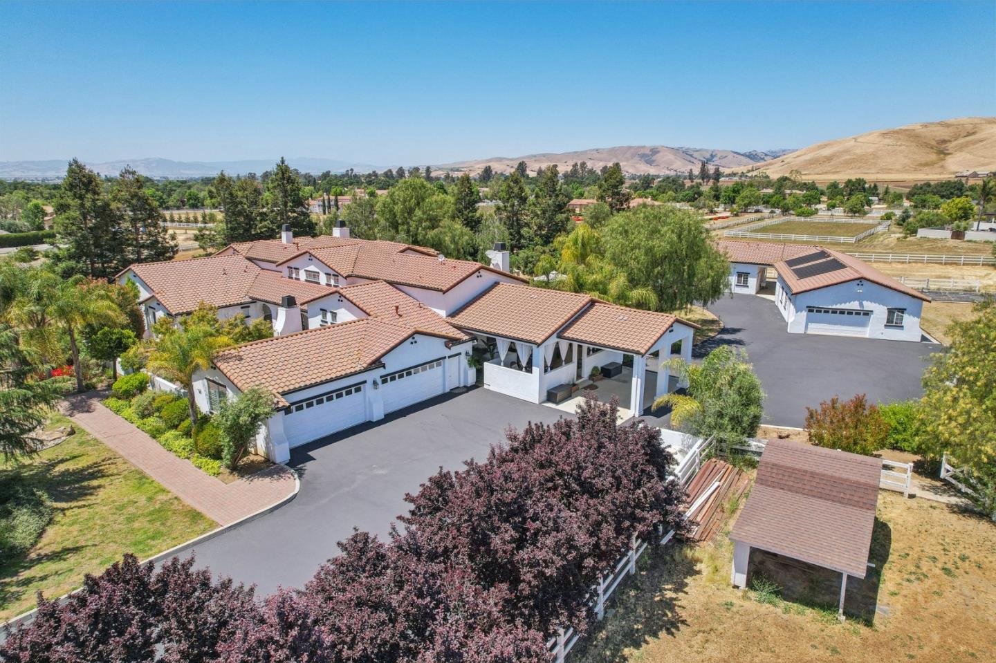 Welcome to Comstock Estates an extraordinary North San Benito County estate on 4.7 acres, designed for luxury living, multi-generational comfort, and entertaining at scale. The single-level 4,308 SF main residence offers 4 ensuite bedrooms, an office/flex room, a gourmet chefs kitchen with premium Miele and KitchenAid appliances, and a stunning wine room holding up to 1,840 bottles. Enjoy soaring vaulted ceilings, handcrafted copper sinks, custom cabinetry, and multiple indoor/outdoor fireplaces. Two additional buildings include a full 2-bed pool house with media/game room and a His & Hers flex space ideal for a gym, office, or workshop plus garages for 6+ cars. The resort-style backyard features a solar-heated pool, spa, stone bar, and 3 gazebos. Equestrian-ready with 1.5 acres of pasture, paddocks, hay storage, and a 1-acre Merlot vineyard with agricultural water. Fully fenced with electric gate, generator, and cameras. A rare opportunity to own a private, fully equipped estate with room for everything.