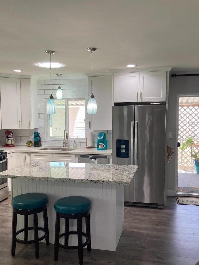 Welcome to this beautifully maintained exclusive gated community. Located in the prestigious 55+ 45 senior mobile home community of Lakeshore Gardens. Exceptional amenities, including a beautiful pool, hot sauna, fully equipped gym and welcoming clubhouse. Actives galore, community gatherings, always a card game or classes. Also enjoy ping pong, billiards, bocce ball and shuffleboard or walk the lake viewing the ducks and turtles. Convenience is key with this home, as it's located directly across the street from a bustling shopping complex, with grocery store to specialty food stores and fantastic dining options. enjoying the beauty of the ocean just a short walk or bike ride away, minutes drive from charming downtown Carlsbad village. Don't miss the chance to make this coastal gem yours! This 2020 remodeled mobile home is just 1500 feet from the Pacific Ocean. It features drywalled with crown molding, luxury vinyl plank flooring, new carpet, paint inside & out, new central heating system, new kitchen with all new white Shaker cabinets, new appliances, LG Wi-Fi washtower, LUXE bidet. 4 new fans, 4 Solatubes skylights, dual pane windows throughout, 2022 new composition roof, new front stairs, secret garden with the ocean breeze and a retractable rear deck awning. $2,525- RENT.