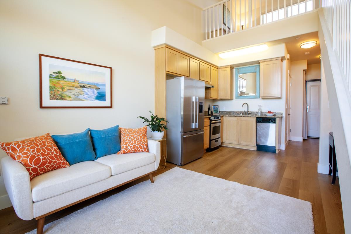 This beautiful, light-filled one-bedroom loft offers a serene retreat in downtown SantaCruz, perfectly blending sophistication with coastal charm. Nestled on the third floor, it features soaring ceilings and oversized windows overlooking a tranquil, tree-lined street. The open-concept living space flows seamlessly into a modern kitchen equipped with granite countertops, updated glass stovetop and oven, and dishwasher ideal for both culinary adventures and casual entertaining. The loft-style bedroom perches above the living area, illuminated by natural light, while the spacious bathroom boasts a walk-in shower. A private balcony invites quiet mornings or relaxed evenings outdoors. Convenience is built-in with in-unit laundry, secure gated entrance, covered assigned parking, dedicated ground-floor storage, elevator access, and a well-lit lobby. The setting offers immediate access to vibrant downtown life: enjoy your morning bagel at The Bagelry, live music at Kuumbwa Jazz Center, and take a short stroll to Cowells Beach, the Wharf, West Cliff Drive, boutiques, breweries, the weekly Farmers Market, and public transit. With UCSC only 15 minutes away and easy access to Highway1/17, this loft provides an exceptional combination of peaceful comfort and urban convenience.