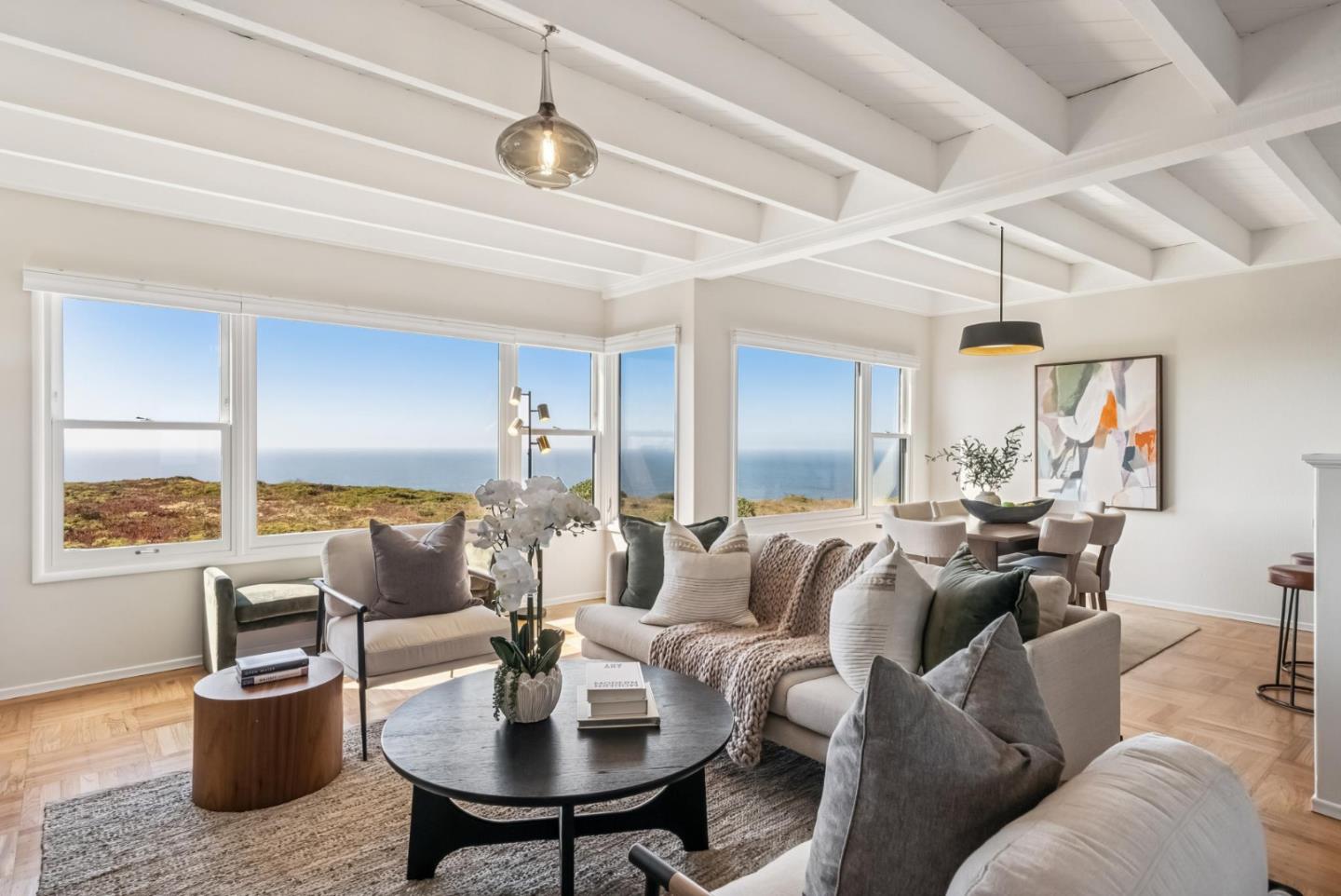 Breathtaking unobstructed ocean, cityscape, Sutro Tower, GG Bridge & Farallon Islands views in this classic mid-century Doelger single-family home. Located in the desirable Westlake Palisades neighborhood and renovated for modern living. An open floor plan features a wall of Marvin dual-paned windows overlooking the ocean and green belt. Fresh paint, refinished solid oak hardwood floors, wood beam ceilings, stylish light fixtures, a remote gas fireplace, & a chef's kitchen with expansive quartz countertops, bar seating, stainless-steel appliances, and modern cabinetry. Four bedrooms include the primary suite, two additional bedrooms, and two remodeled bathrooms upstairs. Custom closet organizers enhance storage. The lower level offers a fourth bedroom with rear yard access, which could also serve as a fantastic family room or home office. Low-maintenance backyard plus a wonderful play and dog park nearby. Significant expansion potential exists in the large two-car garage with exceptional storage. (washer, dryer, and refrigerator remain) Convenient access to San Francisco, Trader Joe's, Westlake, Stonestown, BART, the ocean, the zoo, major freeways, and schools. A perfect mid-century gem, ideal for entertaining or relaxing while enjoying stunning panoramic views from dawn to dusk!