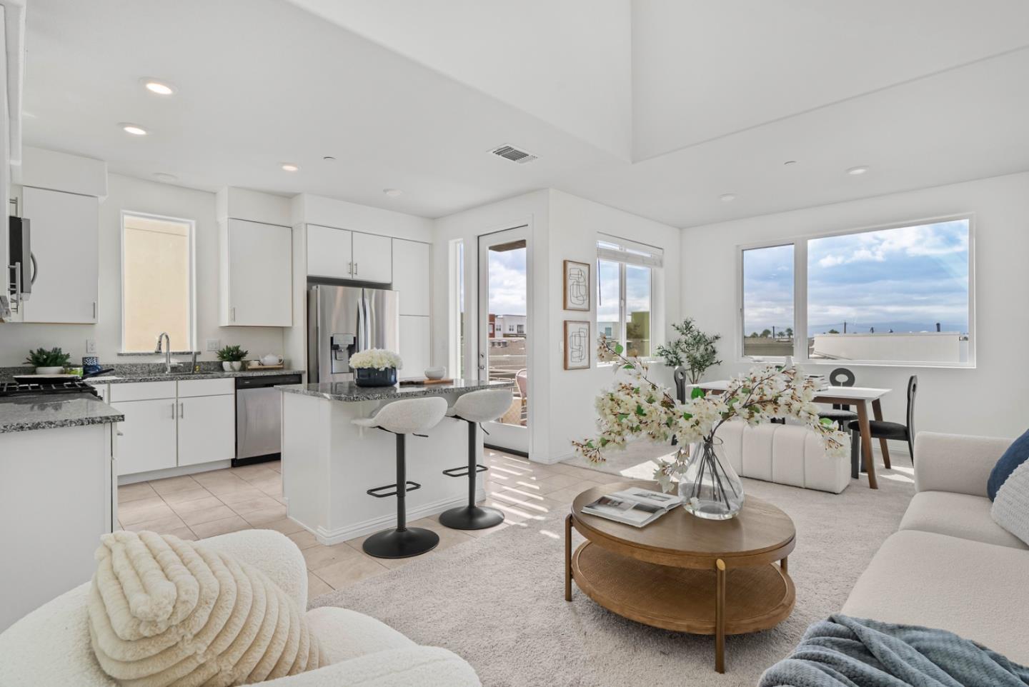 Rare-find modern top-floor LOFT unit in the desirable Metro community. This beautifully maintained home features high ceilings, large windows framing gorgeous mountain views, and an abundance of natural sunlight throughout. The open-concept living area flows seamlessly into a stylish gourmet kitchen with white shaker cabinets, quartz countertops, a large island, and stainless steel appliances. The spacious primary suite includes a walk-in closet and a luxurious en-suite bath with dual vanities. A flexible loft area offers the ideal space for an office, guest room, or media lounge. Additional highlights include a private balcony, in-unit laundry, central A/C, and a rare two-car garage with direct access to the elevator for convenience and security. Built in 2018, this home offers low-maintenance, modern living in a vibrant community. Enjoy proximity to BART, Trader Joes, Great Mall, Ranch 99, dining, and major tech employers, plus community amenities including tennis courts, playground, and open green spaces. This is a fantastic home you don't want to miss!